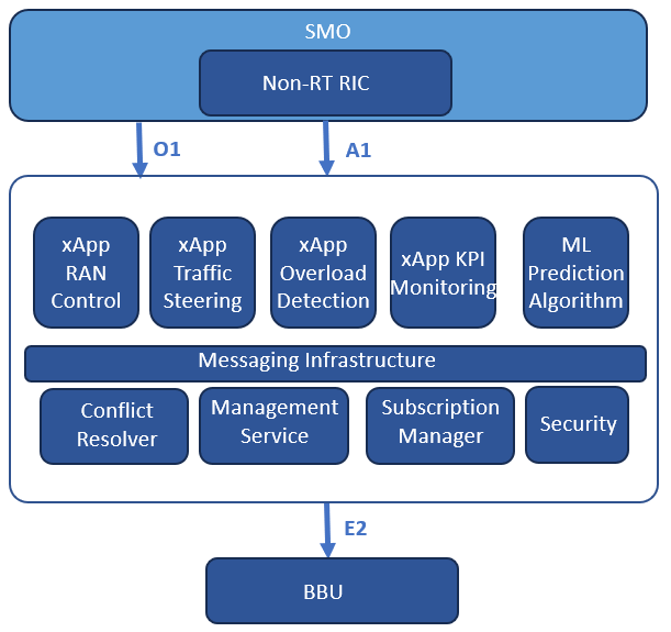 - A Traffic Steering xApp az Overload Detection információk alapján értesiti a RAN Control xApp-ot a döntéséről amit a RAN Control xApp végrehajt (például handover a target cella felé) a Conflict Resolver-en keresztül.